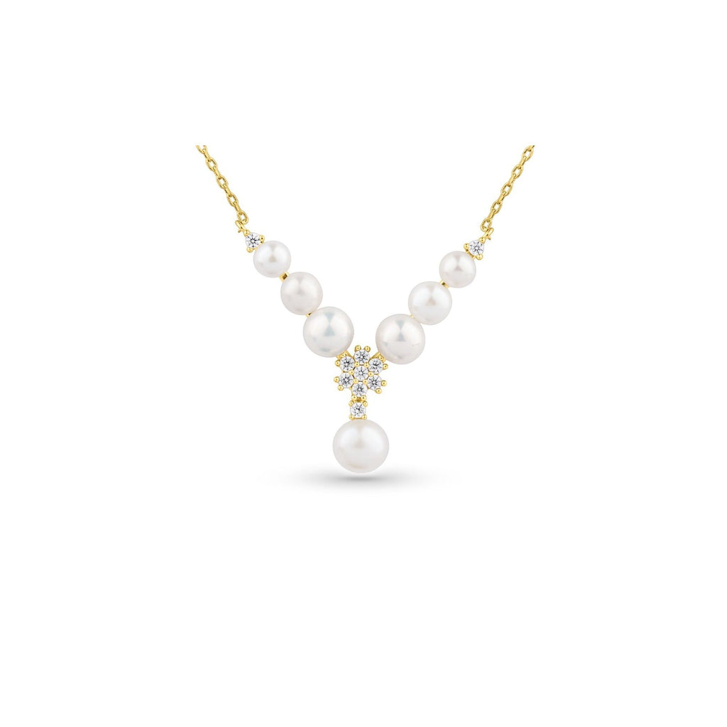 Collier Excellence Plaqué Or 18K 3Mic, serti de zirconiums blancs sur marguerite centrale, et orné de 7 perles de culture. Longueur de la chaine 390 - 420 450 mm.